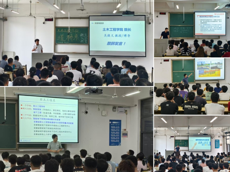 9月6日-8日,各专业班级分别开展了专业教育及开学第一课。新生入学专业教育是新生入校的第一课,是帮助学生建立集体归属感、专业认同感的重要环节。岩土工程系主任刘洋代表岩土工程系全体教师向新生表示热烈欢迎,并向同学们介绍了岩土工程系的发展历程、专业设置、师资队伍和科学研究等方面。结合专业特色、专业发展和就业前景,对地质工程、勘查技术与工程和城市地下空间工程进行了介绍,加深了同学们对所学专业的认识。安全工程系骨干教师根据学科发展、专业建设以及服务安徽省新兴产业生产安全需求,围绕培养方案、课程体系设置、知识能力素质要求、创新创业活动、考研就业等方面进行了具体介绍,使新生充分了解专业概况和发展前景,提升了同学们的专业认同感和归属感。建筑工程系、道路与桥梁工程系、测绘科学与工程系、水利科学与工程系也相继组织了新生入学专业教育活动。邀请学院领导、资深教授、行业专家、青年骨干教师,为2024级新生上了一堂气氛热烈、专业扎实、内容丰富的专业教育课。