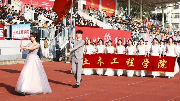 追逐十月的和风,踏着希望的曙光,土木学院的方阵迎面走来——他们的队伍如同一条条修建的地铁隧道,深邃而有力;他们的步伐仿佛一座座崛起的高楼,稳固而坚定。他们是未来建筑的设计师,是桥梁的架设者,是地下空间的开拓者,是地质地貌的勘探者。他们以土木人的智慧,构筑运动场上的奇迹;以土木人的坚韧,铸就赛场上的辉煌。