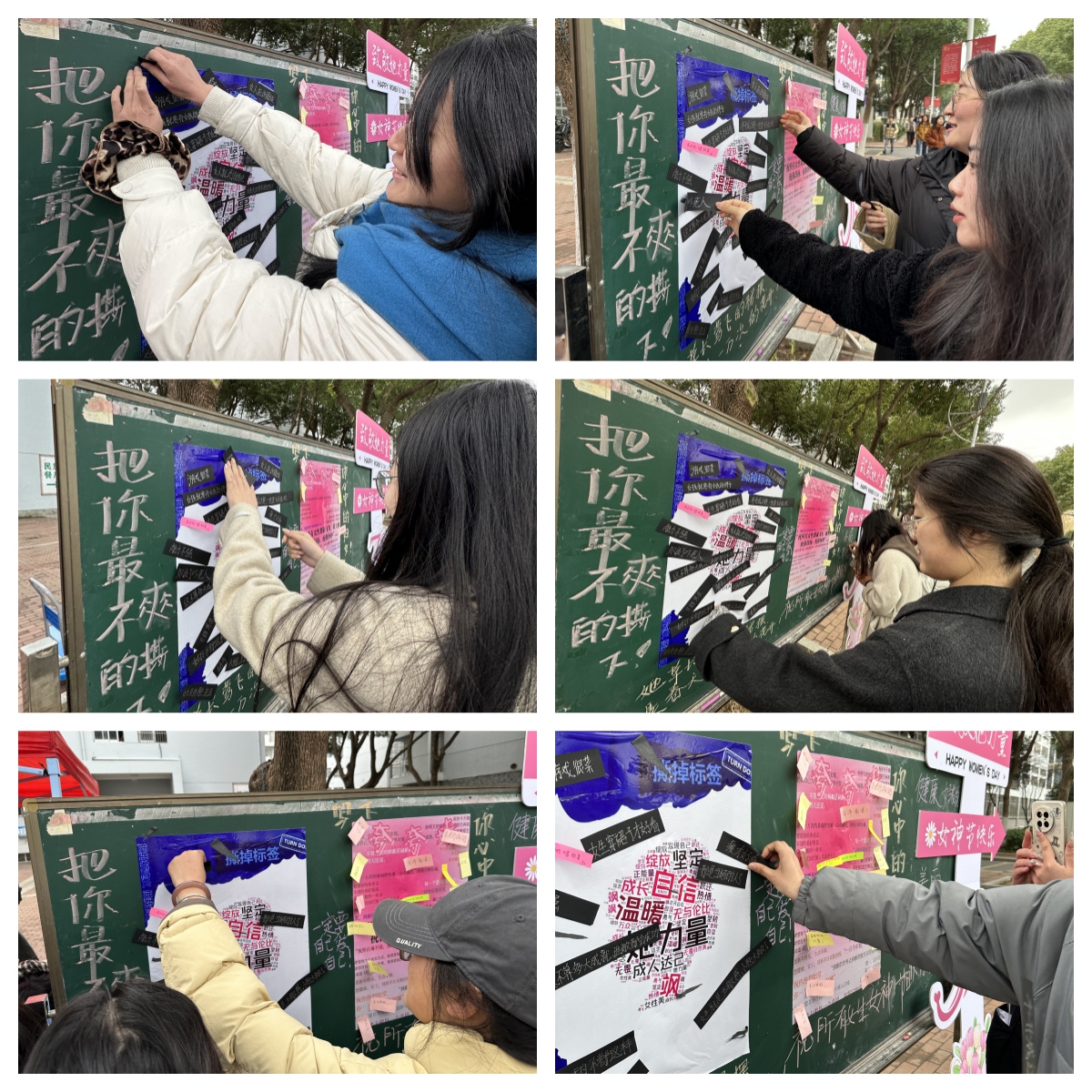 活动在一片轻松愉快的氛围中拉开帷幕大家提前准备了一系列带有传统女性刻板印象的标签,如“柔弱”、“依赖性强”、“不擅长理科”、“娇气张贴在活动现场随着一张张代表着社会对女性常见的偏见和误解的标签被勇敢撕下,女生们用实际行动表达对刻板印象的拒绝与摒弃。这一刻,不仅是对固有观念的勇敢挑战,更是对女性多元能力和潜能的肯定。