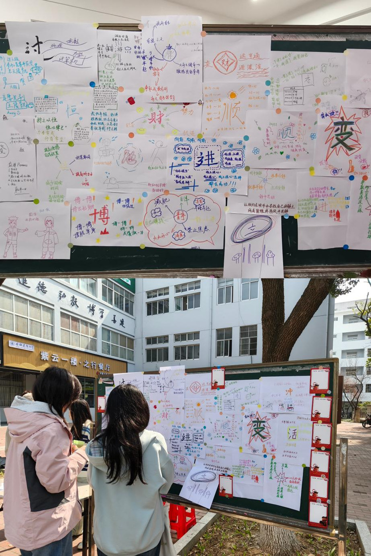 活动还设置了绘制成长版“山河社稷图”的环节。同学们在A4纸上选择一个汉字作为新学期关键字,然后围绕这个关键字,绘制出具体目标和实现方法。有的同学选择 “勤” 字,计划通过每日早起背单词、定期参加学术讲座等方式提升自己;有的以 “健” 为关键字,制定了每周健身计划,决心在新学期塑造健康体魄;有同学写下“韧”字,希望像哪吒一样无畏挑战,每天完成一道力学难题,每周参与一次实践项目。一幅幅充满创意和个性的“山河社稷图”,不仅展示了同学们对新学期的美好憧憬,也体现了他们为实现目标所付出的努力。百余名学子以笔为戟,共同绘制出“我辈岂是蓬蒿人”的青春图景。