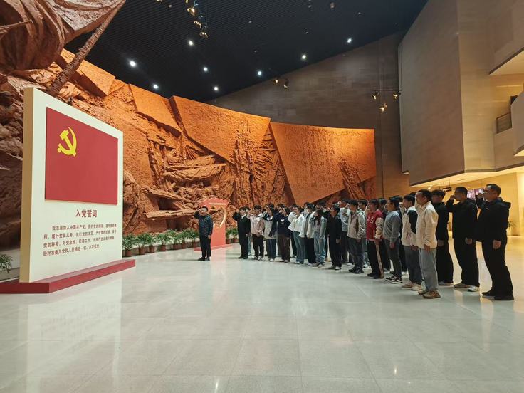 庄严的宣誓仪式将活动推向高潮。学生党员齐聚纪念馆一楼大厅,在辅导员尹迪迪的领誓下,面对鲜红党旗高举右拳,重温入党誓词。“我志愿加入中国共产党……”铿锵誓言回荡在展馆穹顶,与展柜中陈列的1949年党员登记表形成跨越时空的呼应。