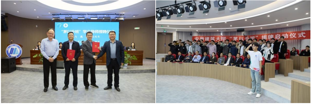 刘文杰向“茅以升班”班主任国家级人才张宁教授颁发聘书,蔡国军授予班旗。