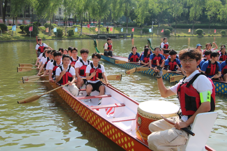 比赛前,队员们会保持每周2-3次的训练,下午下课后,还没从知识的海洋回过神,队员们就已经到达码头。老队员们检查着船桨等设备,带着新来的同学做好热身活动,新队员们摩拳擦掌,跃跃欲试。“咚!咚!咚!” 鼓点突然响起,如同炸响的春雷。鼓手董鑫挺直腰板,双臂抡起鼓槌,每一次敲击都带着雷霆万钧之势。船头的队员们瞬间进入状态,“一、二!一、二!” 的号子声划破寂静,船桨齐刷刷插入水中,划出半人高的水花。每一次认真的训练都是为了更好的迎接比赛。