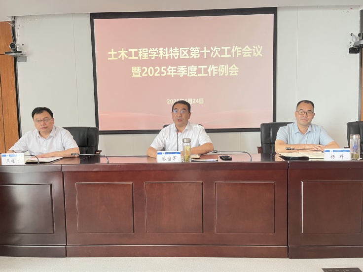 本网讯  2025年6月24日,土木工程学科特区第十次工作例会暨2025年季度工作例会在徽风楼21楼第一会议室召开。会议由校党委副书记、校长蔡国军主持,校党委常委、副校长杨科,校党委常委、副校长王佐才,土木学院、环能学院、材化学院相关负责人以及学科特区骨干成员参加会议。本次会议集中探讨了学科特区建设的成果,全面梳理了过往经验,并规划了未来的发展方向,以促进土木工程学科的持续且高质量发展