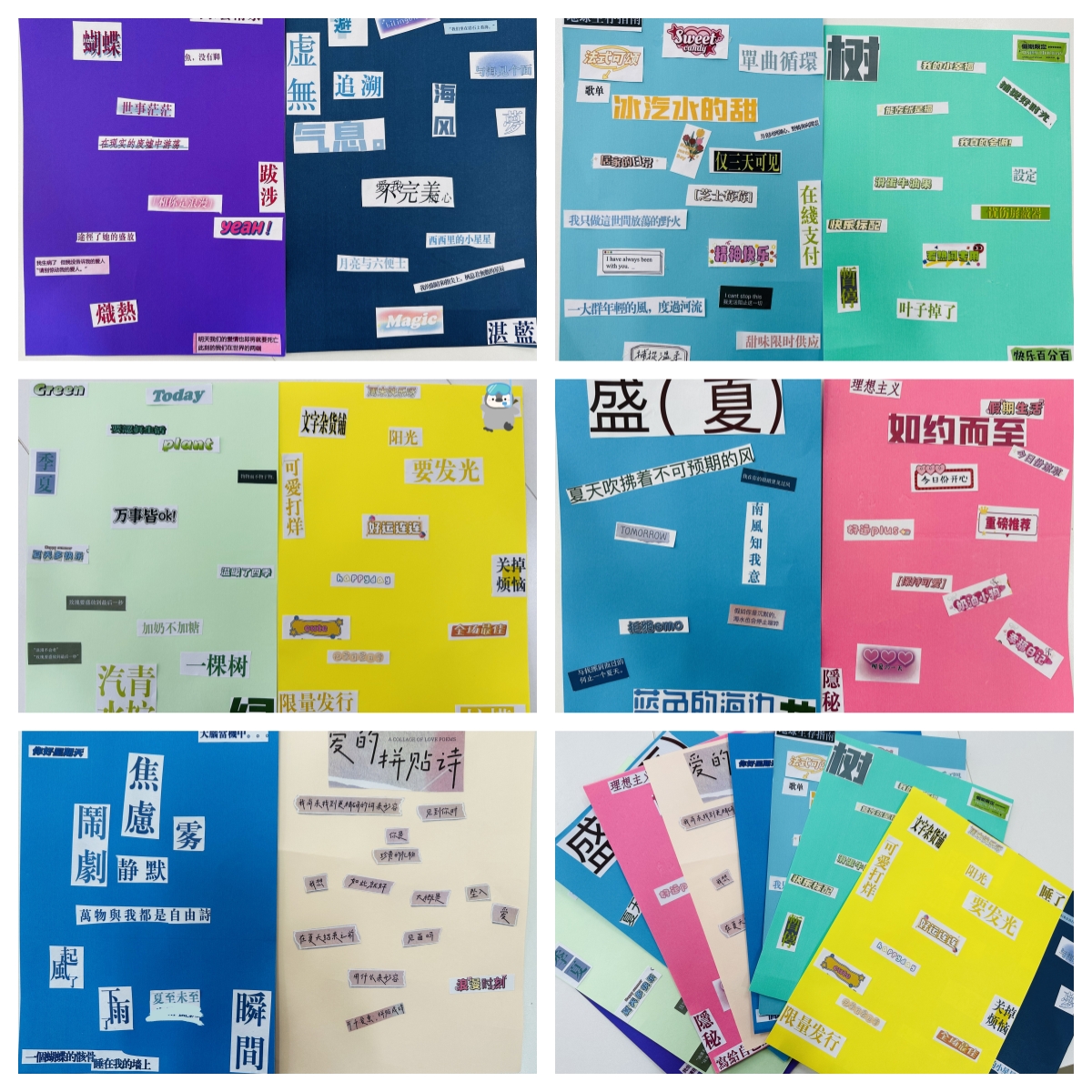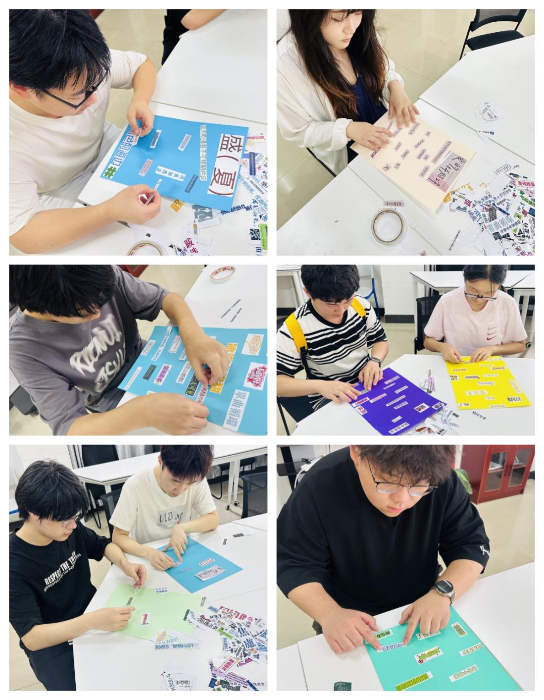 在创作环节,大家发挥自己的聪明才智,沉浸在自主动手创作的喜悦中,围绕“拆解与重构”主题,充分表达自己的创作思路和理念。专注地在各类素材中寻觅灵感,有人精心挑选出充满希望的词句,表达对未来的憧憬;有人将富有情感的文字与图案巧妙搭配,诉说着成长中的困惑与感悟。每一张拼贴诗作品都独一无二,是同学们内心世界的真实写照。一位参与活动的同学分享道:“在拼贴的过程中,我仿佛在和自己的内心对话,原本有些迷茫的情绪,通过这种方式得到了梳理,感觉轻松了许多。”