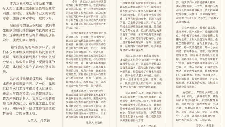 日记里,既有对水利设施细节的精准描摹;也有对专业问题的深度思考,如针对混凝土裂缝成因的分析、对自动化监测系统的优化构想,字里行间满是理论与实践碰撞的火花。团队还在日记中特别记录工作人员的经验之谈,将“水利工程三分建七分养”等行业箴言与课堂知识对照,形成独特的 “实践知识库”。这些日记不仅是个人成长的印记,更成为团队协作的纽带。每日晚间的组会上,成员们交流心得、互补视角,将碎片化观察整合为系统认知。正如团队成员在日记结语中所写:“笔端划过纸面的痕迹,亦是知识扎根实践的深度。” 土木学院“城西拦蓄•水韵匠心”暑期三下乡实践团队,以水利研学为桥,让青春力量扎根基层大地。团队在郎川河与天子门水库的探索中,不仅用脚步丈量水利工程的实用价值,更以日记为墨,将专业知识与一线实践深度融合。那些关于设施运维的细致记录、针对问题的解决方案,正是“三下乡”服务社会、振兴乡村、锤炼本领的生动注脚。从课堂理论到田间地头的实践转化,从纸上谈兵到为水利建设献智献策,实践队以实际行动诠释着青年学子的担当 —— 让知识在服务中落地,让成长在奉献中扎根,这便是暑期三下乡赋予青春最厚重的意义。(文/图/视频:范瑾、贺远航、孙文哲;一审:叶训;二审:马智鑫;三审:王媛) |