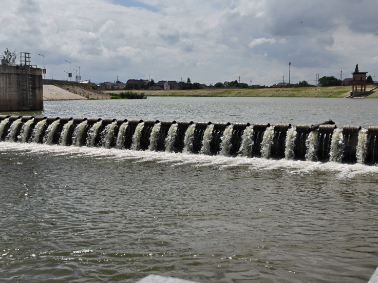 离开管理房,团队前往拦河坝现场深入考察。在观察闸室、消力池等结构时,师生发现闸门间卡有枯木,工作人员通过调节闸门水流成功疏导,让同学们实地见证闸门运行的稳定性。针对“输水管道进口为何设滤网”的疑问,余金煌教授与方佩佩老师详解:滤网可截留杂质,避免管道堵塞与设备磨损,生动诠释工程设计的细节考量。同时,团队也留意到工程现存缺陷,如混凝土细微裂缝、钢筋外包混凝土施工质量隐患等,师生就此展开热烈讨论,深化对工程耐久性的理解。行程中,团队还在河上游发现小型水工建筑物,通过平面钢闸门与控制房的联动原理,进一步掌握水位与流量调节机制。最后,无人机俯瞰视角下,拦河坝与水面、周边设施相映成景,让同学们深刻感悟水利工程平衡生态与民生的智慧,为第一天实践画上圆满句号。 探库溯源研蓄水,天子门岸悟匠心 怀揣着对未知乡村的期待与探索精神,实践团队踏上了前往郎溪县十字镇天子门村的征程。此次实践,旨在深入了解乡村水利设施的实际情况,运用所学知识为乡村发展贡献力量。一路上,车窗外的景色不断变换,从繁华的城市逐渐过渡到宁静的乡村,田野、山峦和错落有致的农舍映入眼帘,仿佛一幅徐徐展开的田园画卷,也让同学们对即将开展的实践活动充满了更多的憧憬。