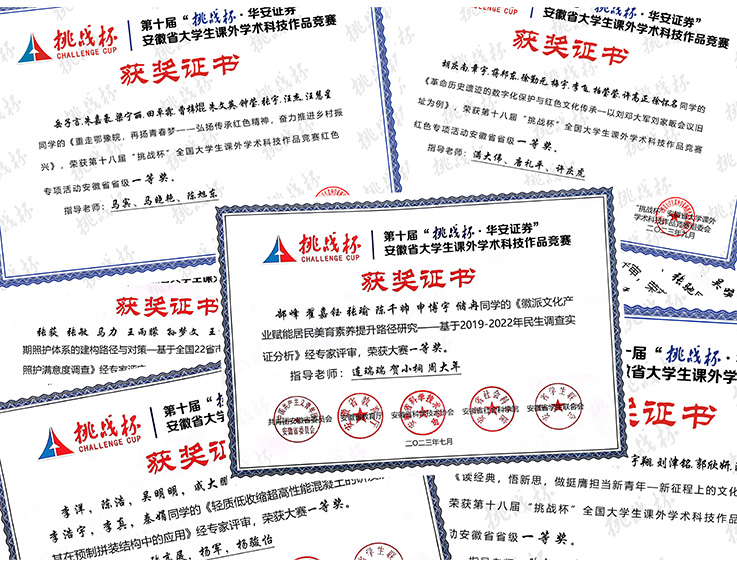 本届“挑战杯”共吸引全国2000多所高校、40余万件作品、250多万名学生参赛。我校自2022年4月启动“挑战杯”大学生课外学术科技作品竞赛以来,首办挑战杯“青苗”训练营,深入学院举办二十余场专家指导会,二十余场训练营交流沙龙,优化选题合理组队,并组织项目成员赴中科院、社科院交流学习,最终经过专家评审、院校两级选拔推荐作品参加省赛,获得省级一等奖七项。其中,材化学院的《SnS2基光阳极材料研发及其制氢应用》、公管学院的《失能老人长期照护体系的建构路径与对策一一基于全国22省市1208名失能老人长期照护满意度调查》以及《徽文化产业赋能居民美育素养提升路径研究》晋级国赛,荣获主体赛国家级三等奖。