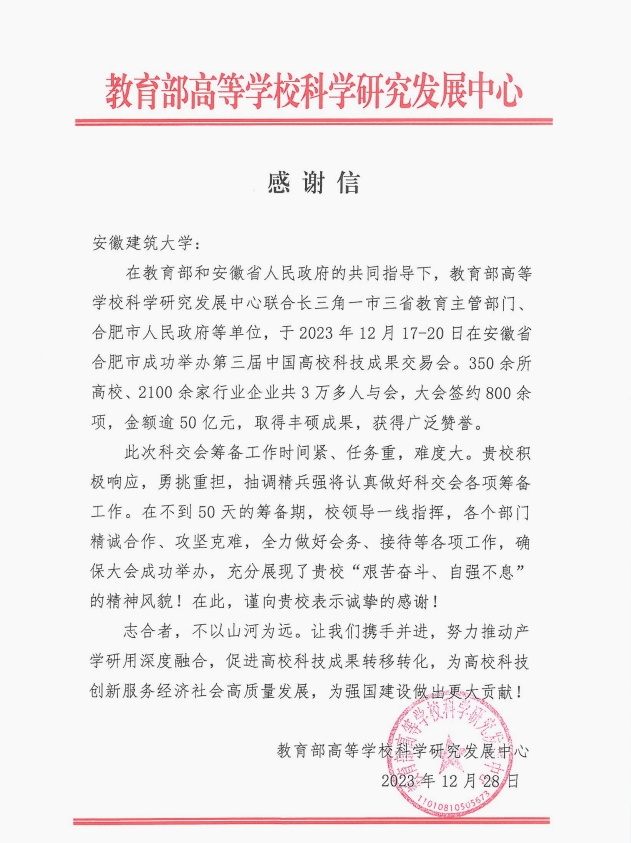 本网讯 近日,我校收到教育部高等学校科学研究发展中心发来的感谢信,对学校在第三届(2023)中国高校科技成果交易会筹备工作的突出贡献致以诚挚感谢。