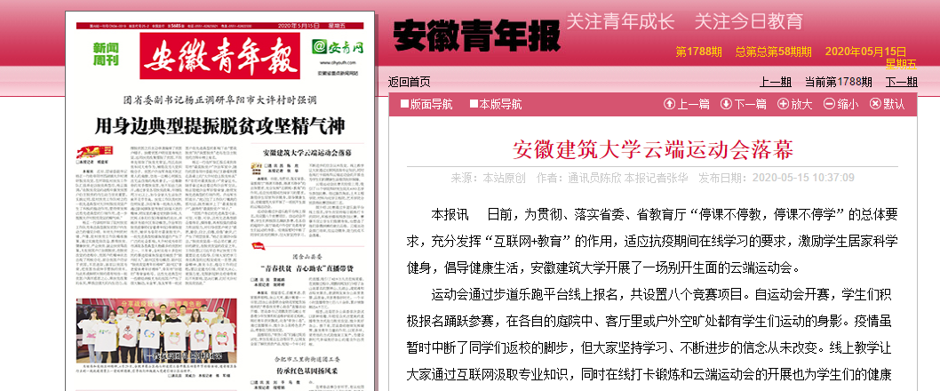 编者按:近日,学校云端运动会圆满落下帷幕。515日,安徽青年报头版对此进行了报道,518日,学习强国平台进行了转载推介。