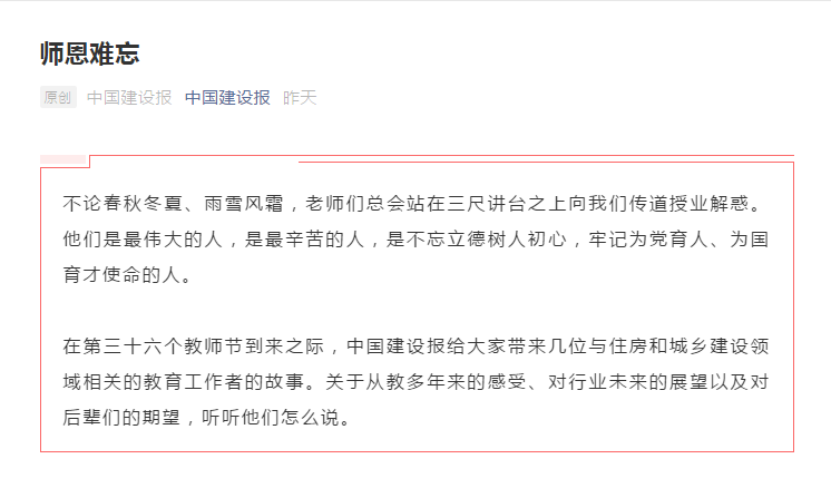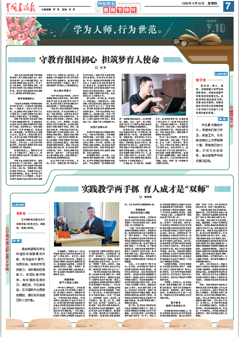 本网讯 立德树人奋进担当,教育脱贫托举希望。在第三十六个教师节到来之际,中国建设报9月10日刊载了几位建筑类高校教师的育人故事。该报以《守教育报国初心 担筑梦育人使命》为题,在七版以半个版面的篇幅对我校数理学院张学勇教授的多年育人心得进行了报道。中国建设报官方微博同时进行了推送。