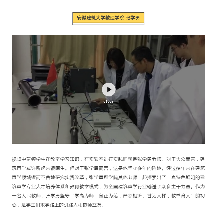 “新生在入学初期普遍对所学的专业充满迷茫,对专业知识缺乏了解。”在教学初期,张学勇普及声学专业知识以及建立知识体系,带领学生参观体育馆、影剧院、报告厅、医院、KTV、冷却塔、发电机房等公共和民用建筑,让他们切身体验感受声环境。同时加强实践教学,带领学生们做实验、现场检测和工程项目深化设计,帮助学生开阔视野、加强实践应用。“通过体验和现场教学,极大地提高了同学们的学习兴趣和动手以及创新创业能力。我指导的学生曾获得国家级、省级大学生创新创业项目20余项,在各类竞赛中多次获奖,其中有学生获得第五届“互联网+”大学生创新创业大赛安徽省金奖、国家级银奖”。张学勇对此非常感到非常自豪。