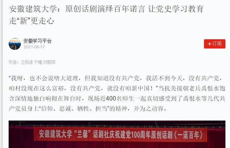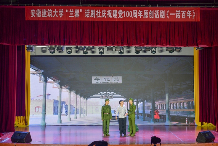 2018级土木工程2班学生于昊冬在剧中饰演老兵禹恨水,在演出结束后感慨地说:“从星星之火到燎原之势,从开天辟地走到伟大复兴,百年披荆斩棘,百年风雨兼程。经历了这次话剧的编排和演出,我真切地感受到了中国共产党一路走来的艰辛与今天幸福生活的来之不易!”