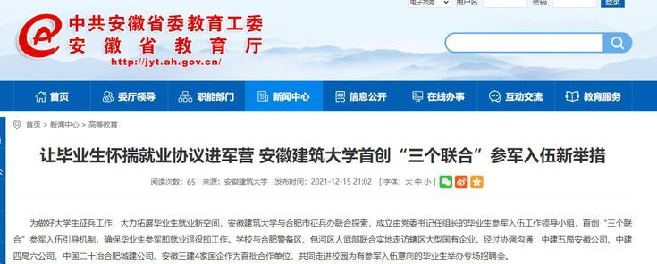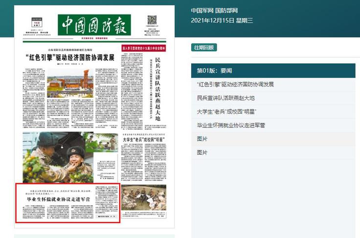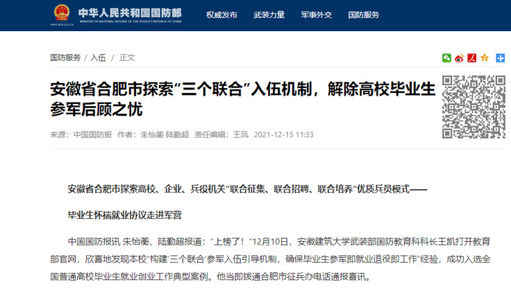 编者按: 12月15日,《中国国防报》头版刊发《安徽省合肥市探索高校、企业、兵役机关“联合征集、联合招聘、联合培养”优质兵员模式--毕业生怀揣就业协议走进军营》,详细报道我校以“三个联合”助推征兵工作模式。中国国防部网站、安徽教育网同步进行转载推介。