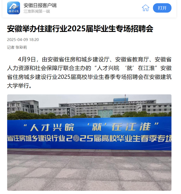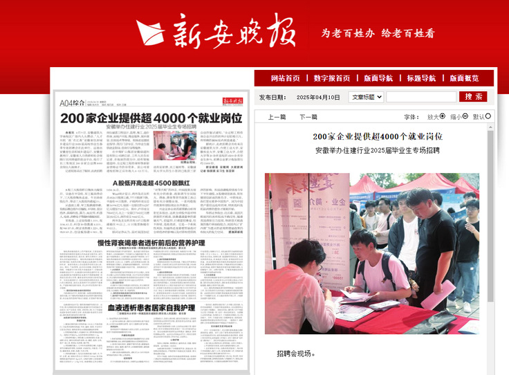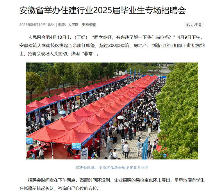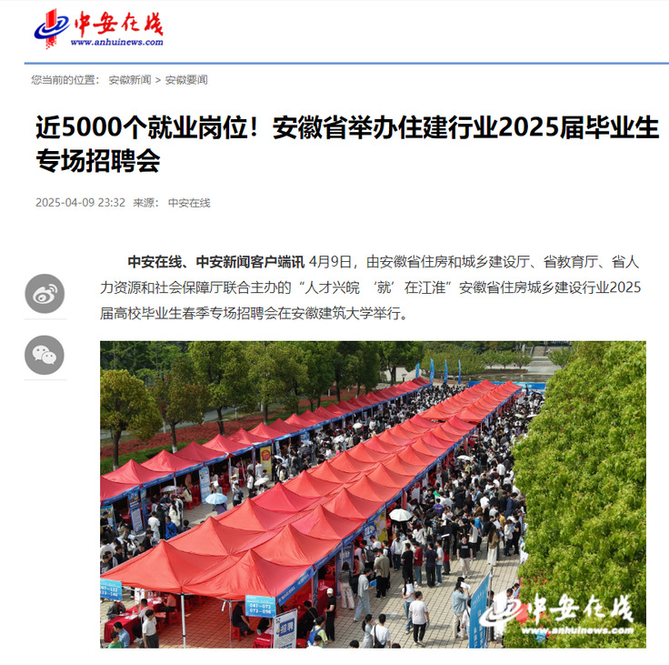 编者按:4月9日,安徽省住房城乡建设行业2025届毕业生春季招聘会在学校举办。200余家优质用人单位进校招聘。人民网,安徽日报,新安晚报,中安在线等媒体进行宣传报道。