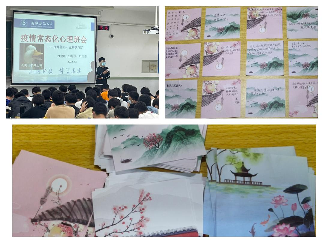 为给学生的心灵提供了一个表露倾诉的平台,学院组织每个班级开展了明信片互换活动,参与此活动的同学需要在明信片上写一段温暖祝福,书写完毕之后放到指定地点,便可随机从写好的明信片中抽取一张,这样每位同学在寄出心声的同时,又收到了一份他人的信件,收获一个由陌生人送给自己的祝福,在心中洒下暖暖阳光。