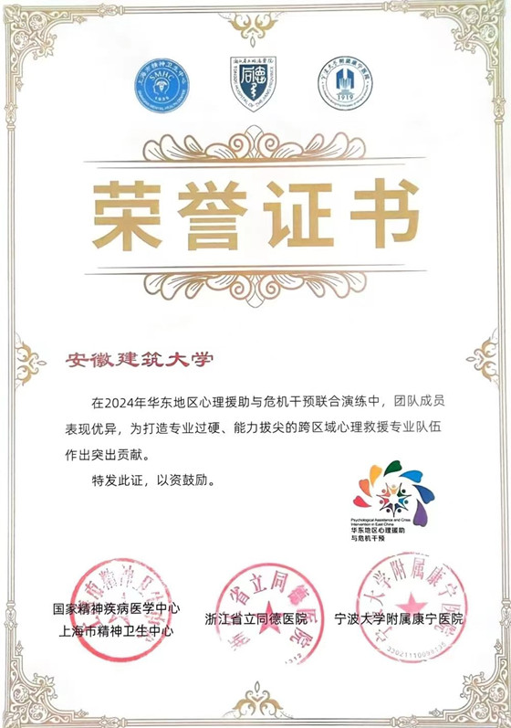 由于团队成员表现优异,学校获得由国家精神疾病医学中心上海市精神卫生中心、浙江省立同德医院和宁波大学附属康宁医院颁发的“为打造专业过硬、能力拔尖的跨区域心理救援专业队伍作出突出贡献”的荣誉称号。这是对学校心理援助与危机干预工作的充分肯定。接下来,学校将持续加强专业队伍建设,为构建和谐校园,全面提升学校心理健康教育与危机干预水平,促进学生健康成长成才提供更加有力的保障,持续助力安徽省心理救援与危机干预公益事业发展,为维护社会稳定、促进人民幸福积极贡献力量。(文/图:段宁 汤娜;审稿:徐庆和)