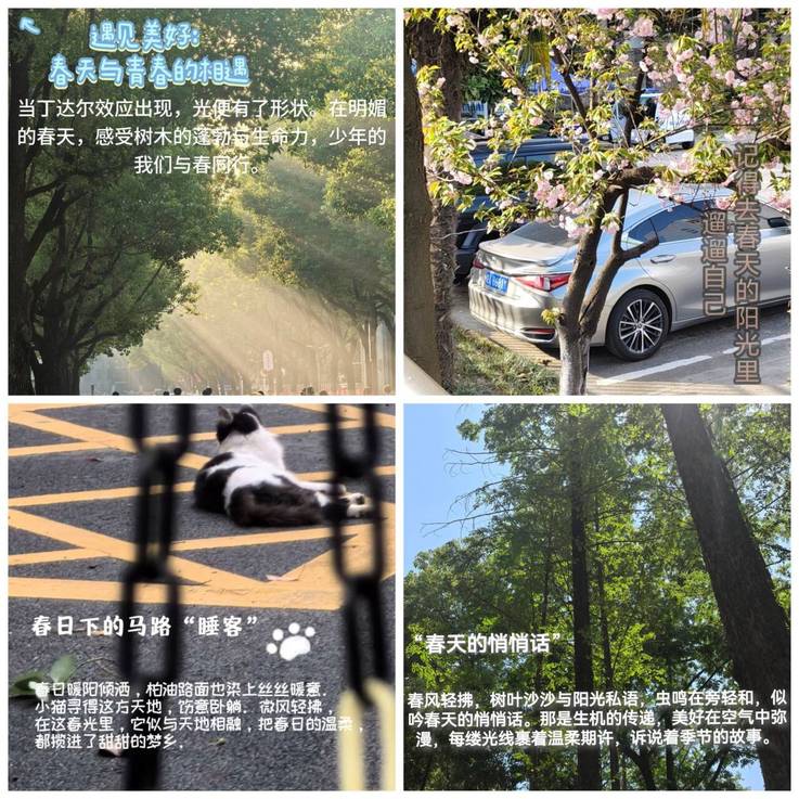 在“框住春天,定格幸福”校园春日摄影活动中,同学们化身校园“春日捕手”,以独特视角捕捉校园中的春日元素。镜头下,绽放的樱花如云似霞,晨读的长椅在暖阳中静谧安详。每一张照片都承载着同学们对校园生活的热爱与对幸福的感悟,大家还为每张照片精心创作了一句创意标题。这些照片和标题不仅展现了校园的春日美景,更传递出积极向上的生活态度,让同学们在欣赏美的过程中,释放压力,感受生活的美好。