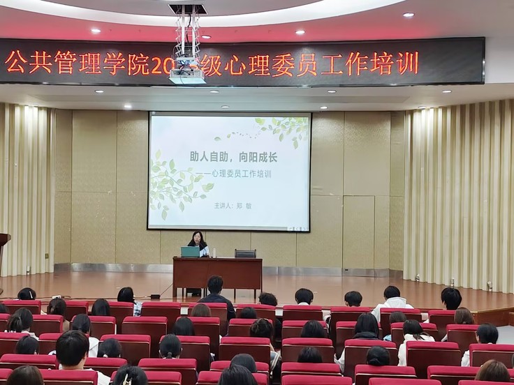 本网讯 近日,为提升学院学生朋辈帮扶能力,助力学院心理健康教育工作有效开展,公管学院在图书馆二楼报告厅举办2025级新生心理委员及寝室长工作培训会,学院郑敏副教授担任主讲,学院全体2025级新生心理委员及寝室长参加本次培训。