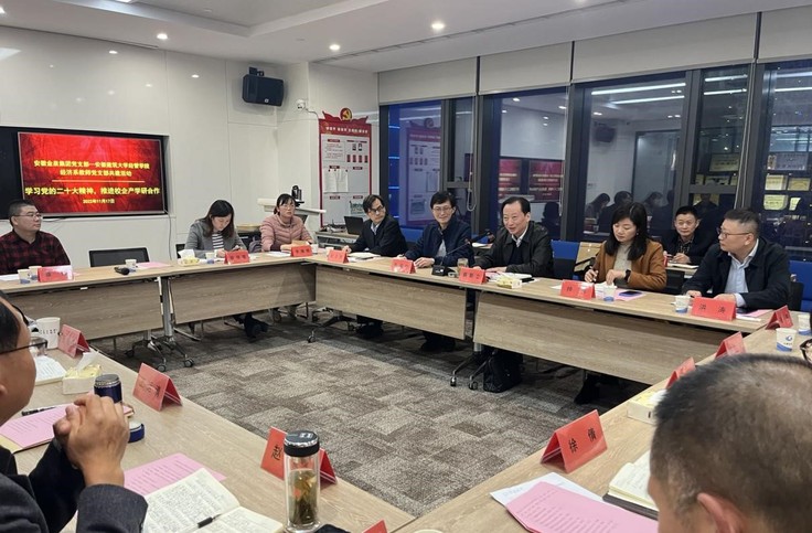 本网讯 为认真学习宣传贯彻党的二十大精神,进一步探索高校与企业党组织党建新模式,增强党建优势互补,以高质量党建助推业务发展,近日,经管学院经济系教师党支部赴安徽金泉会计师事务所开展支部共建活动。校党委常委、副校长蔡新立率领科技处、科技成果转化中心负责人莅临现场指导,安徽金泉会计师事务所领导及全体党员、经管学院班子成员、经济系教师党支部党员教师代表参加活动。