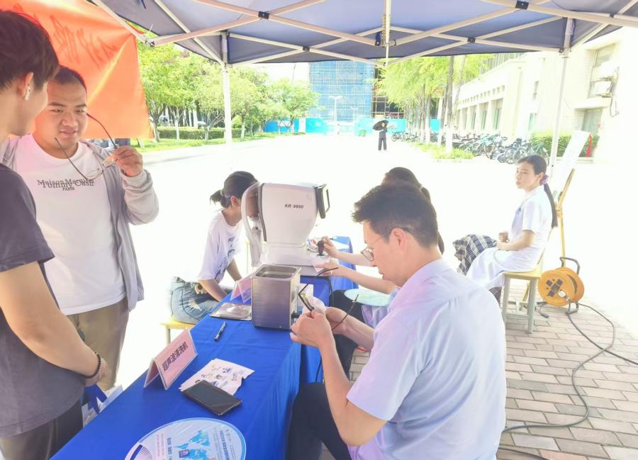 本次义诊涵盖裸眼视力检测、电子验光、眼镜清洁及治疗咨询等内容。专家团队通过一对一、现场检查、现场问诊等方式,为师生解答健康疑问,并针对常见视力问题提出个性化建议。