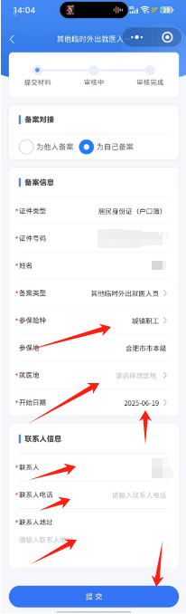6.相关个人参保信息会系统自动关联显示,就医地选择需要就医的直辖市或地级市,开始日期选择到入院、就诊日期前,以免影响正常结算。联系人信息填好后,选择提交即可。