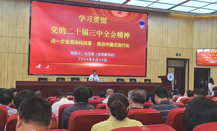 马文革从党的二十届三中全会重要地位和意义、深入学习领会习近平总书记在全会上的重要讲话精神、全面准确理解《中共中央关于进一步全面深化改革、推进中国式现代化的决定》(以下简称《决定》)提出的进一步全面深化改革重大举措、深入学习贯彻全会关于深化教育综合改革的新部署新要求、全力以赴抓好全会精神贯彻落实等五个方面,对党的二十届三中全会精神作了系统的阐释和解读,围绕学习宣传贯彻党的二十届三中全会精神,通过摆事实、列数据深刻剖析了学校改革发展面临的形势任务,有针对性地提出学校高质量发展的重点任务举措。