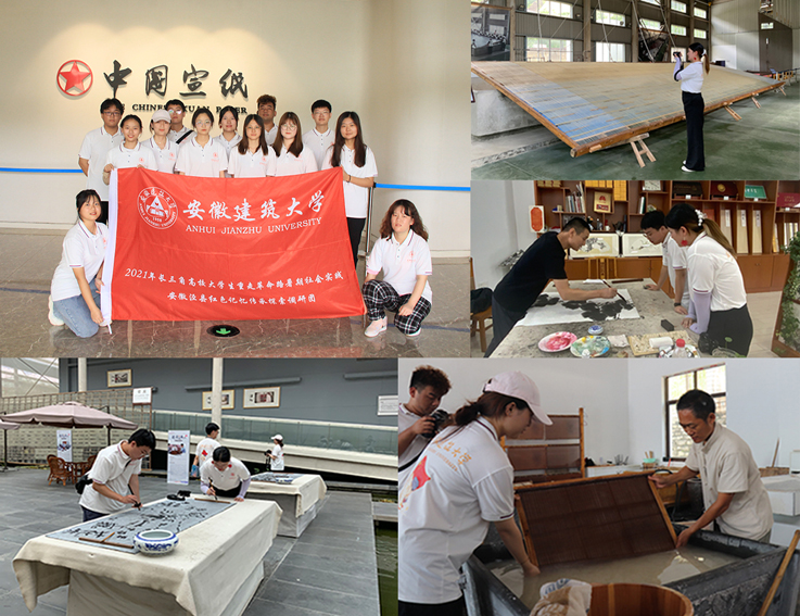 在“古城青山多烂漫,纸载风土代代传”方面,团队克服了酷暑与暴雨的考验,踏着泥泞小路,深入乡村一线,实地走访探寻了泾县徽派花砖古建厂、中国宣纸文化园、宣窑陶坊、“三兔”宣笔厂等宝贵的非物质文化遗产传承之所。