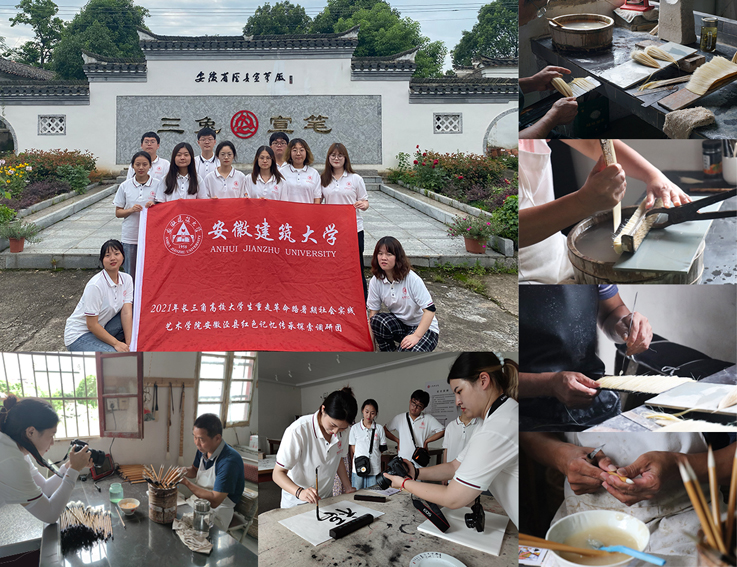 在“古城青山多烂漫,纸载风土代代传”方面,团队克服了酷暑与暴雨的考验,踏着泥泞小路,深入乡村一线,实地走访探寻了泾县徽派花砖古建厂、中国宣纸文化园、宣窑陶坊、“三兔”宣笔厂等宝贵的非物质文化遗产传承之所。