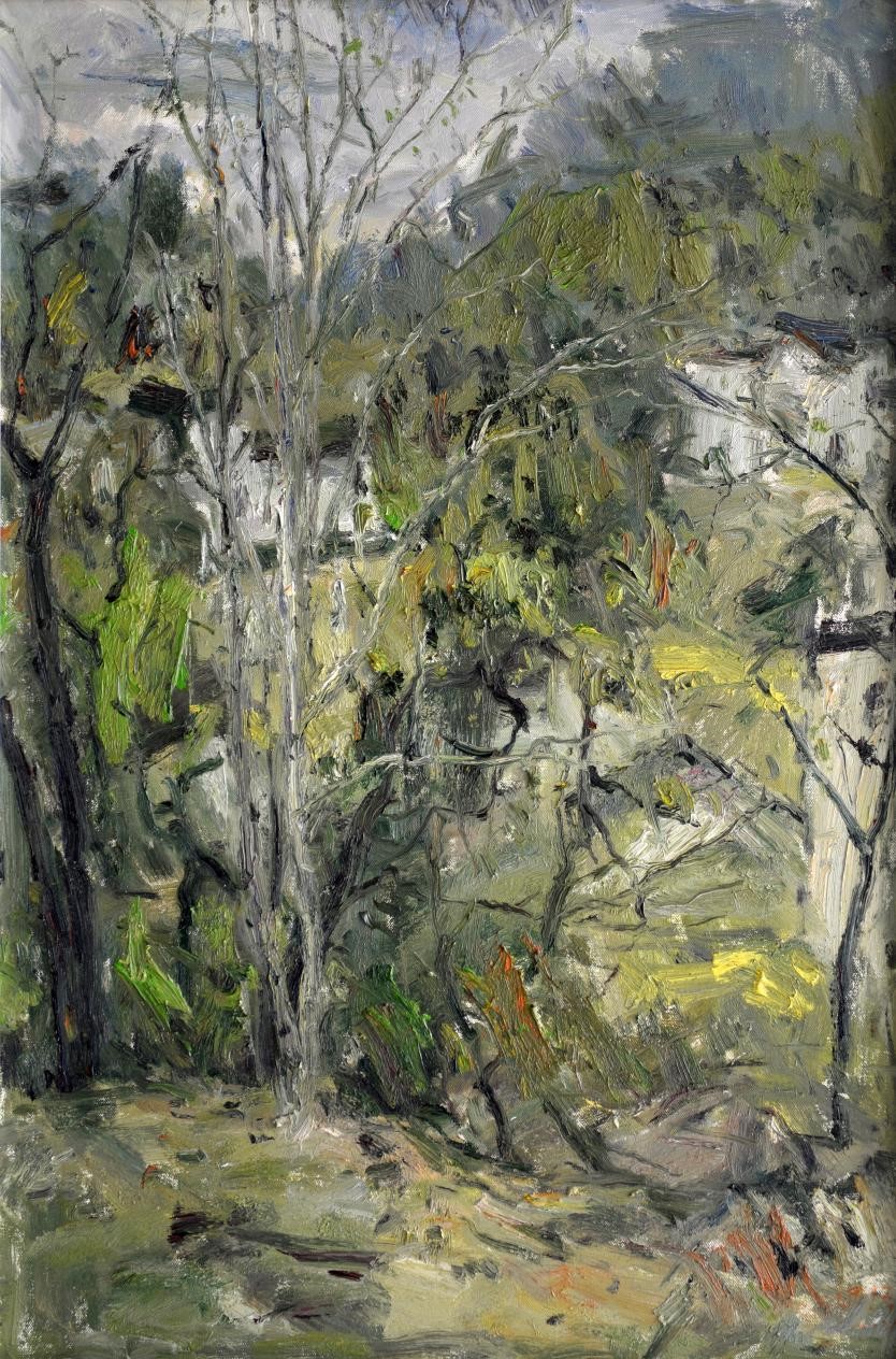 作品《春望白石岭之二》以沉稳的色彩、意象的造型、潇洒的笔触把皖南钟灵隽秀的风景灵动地表现出来。画面捕捉有形与无形的物象,精心布局,营造出深远又温馨的画面气氛,同时又让观者有身临其境的感受。
