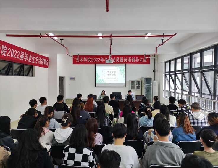 本网讯 秋风飒爽,丹桂飘香,艺术学院考研学子正全力备考,努力交出一份满意的答卷。为提升学生考研自信,帮助学生备考英语科目,10月13日下午,艺术学院在实训综合楼7406会议室召开了考研动员会暨英语辅导讲座。