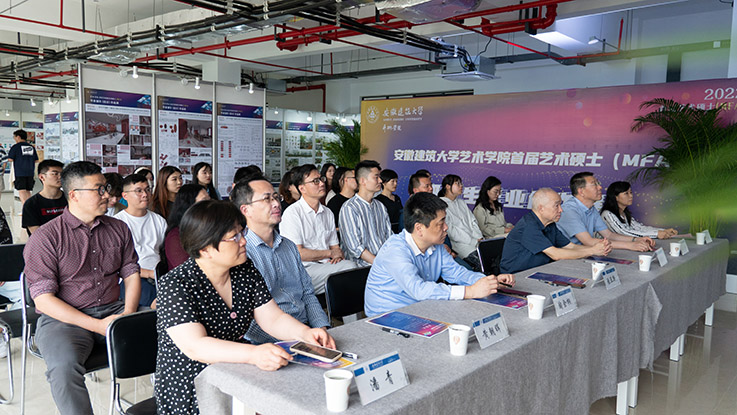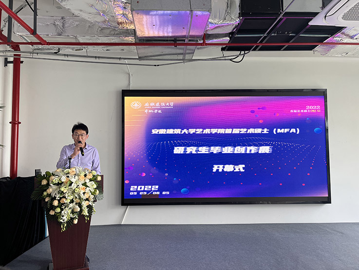 本网讯 5月26日,艺术学院2022首届艺术硕士毕业创作(设计)作品展在实训综合楼二楼展厅隆重开幕。校党委常委、副校长张亚新、研究生院院长朱达荣、合肥工业大学建筑与艺术学院教授陈新生、安徽安兴装饰工程有限责任公司董事长陶余桐、艺术学院党政领导、硕士生导师、研究生出席。本次开幕式由艺术学院副院长邢瑜主持。
