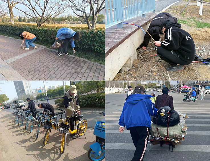 同学们从日常生活小事做起,维护公共环境的卫生与秩序,清扫难度较高地方与树枝上的垃圾,将横七竖八甚至是倒在地上的共享单车抬到规范停放地点,统一摆放整齐,路面变得更加整洁,行人也多了一份安全保障。