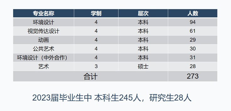艺术学院2023届毕业生共275人,其中本科生245人,研究生30人。环境设计专业毕业生94人,视觉传达设计专业毕业生61人,动画专业毕业生29人,环境设计(中外合作)专业毕业生31人,公共艺术专业毕业生30人,艺术硕士30人。