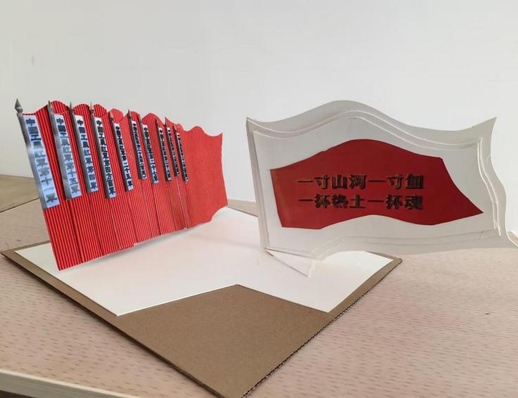 22级视觉传达专业乔龙帅与田倩倩以卡纸和瓦楞纸为创作素材,以再创作的形式展现了金寨县革命烈士纪念馆馆藏的红旗以及形象立牌模型,红色的旗帜在阳光的映射下熠熠生辉,烈士们开辟出的新天地由新时代的青年们继承与传承。