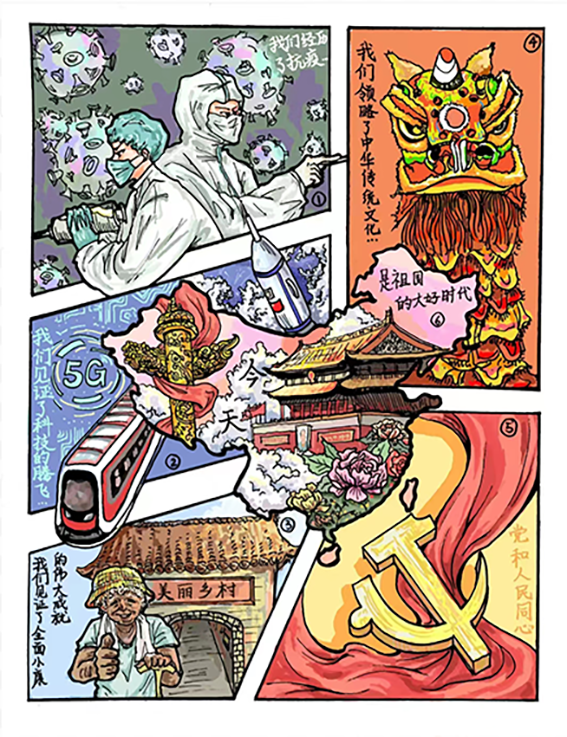 22公共艺术的马雯雯同学运用漫画的形式,从“抗击疫情”、“脱贫攻坚”、“5G速度”等视角,描绘了党和国家事业取得的历史性成就,展现了中华民族自信自强、守正创新,踔厉奋发、勇毅前行的精神品质。