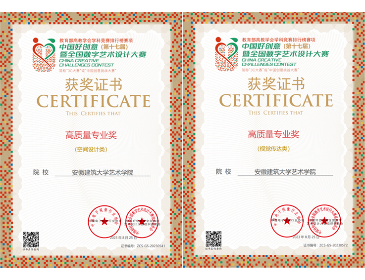 中国好创意暨全国数字艺术设计大赛(简称“3C大赛”或“中国创意挑战大赛”)是由中国电子视像行业协会、中国好创意暨全国数字艺术设计大赛组织委员会主办,入选中国高等教育学会发布的《全国普通高校学科竞赛排行榜》的重要赛项。是我国第一个面向数字艺术设计、数字创意及数字媒体、数字技术创新领域各专业的规模大、参与院校多、影响广泛的权威综合赛事。在经历了2023上半年的省赛突围与暑期国赛争夺,艺术学院参赛作品在该赛事中表现亮眼,共荣获国家级一等奖5项、二等奖5项、三等奖10项,教师组获奖2项,并获得赛事组委会颁发的高质量专业奖2项、国家级优秀组织奖1项。