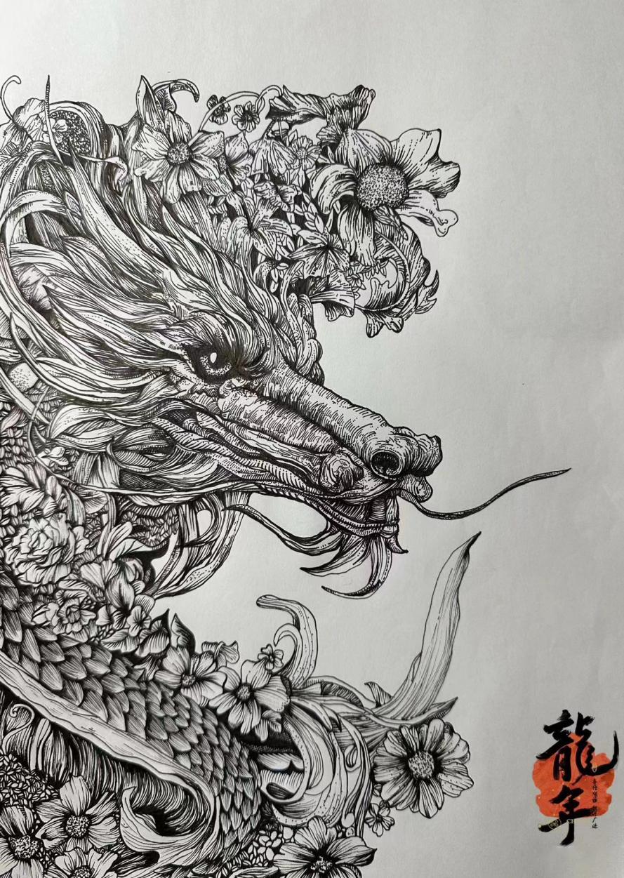 23级环设中外专业程颖君的绘画作品《龙·震鳞》融合经典的龙形图案与繁复的花卉元素,以彰显内敛而高贵的气质,突出了龙的神秘韵味与丰富内涵。