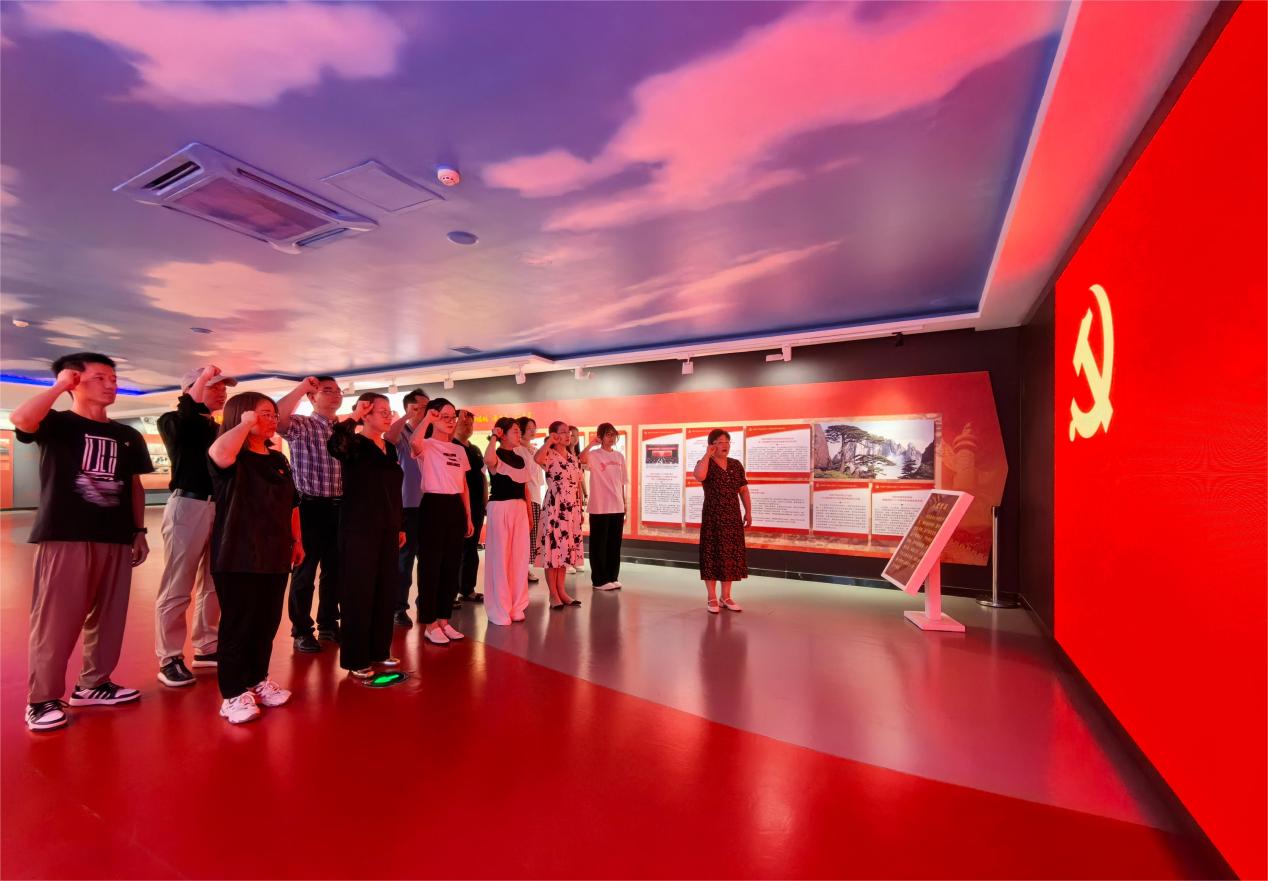 随后,在艺术学院党委副书记(主持工作)潘青的领誓下,全体党员面对党旗、举起右拳,重温入党誓词,誓言铿锵有力,在展馆内久久回荡。