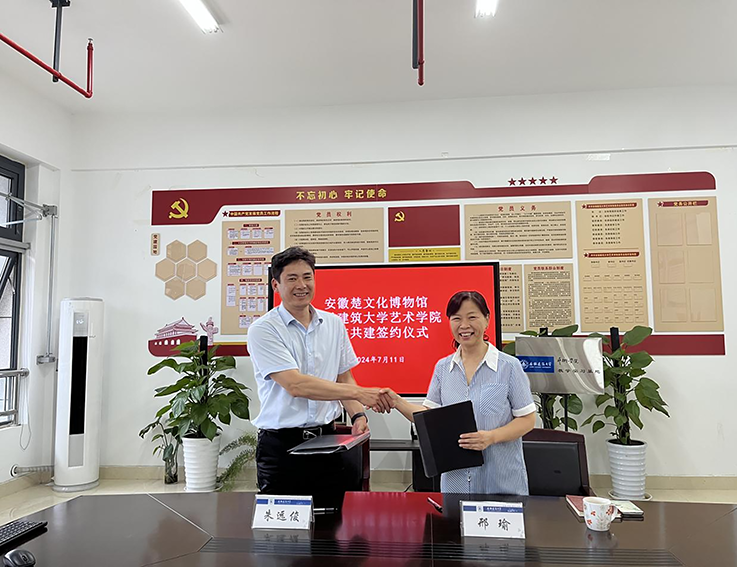 本网讯 7月11日上午,安徽楚文化博物馆副馆长朱远俊、陈列部赵晓雨、典藏研究部杨琨一行来我校调研。艺术学院副院长(主持工作)邢瑜、副院长黄朝晖、教学办主任孙强、非物质文化遗产保护传承创新团队负责人陈治军等参加了座谈。双方正式签订合作共建协议,将积极推进安徽楚文化博物馆和艺术学院在各自优势领域开展全面合作,共建实践教学基地,创新高校大学生实践教学方式,推进科研课题合作与成果转化,依托馆藏传统文化艺术精品赋能高等教育发展,服务安徽文化建设,促进楚文化历史资源活化与应用,传播中华优秀传统文化。