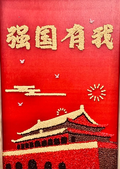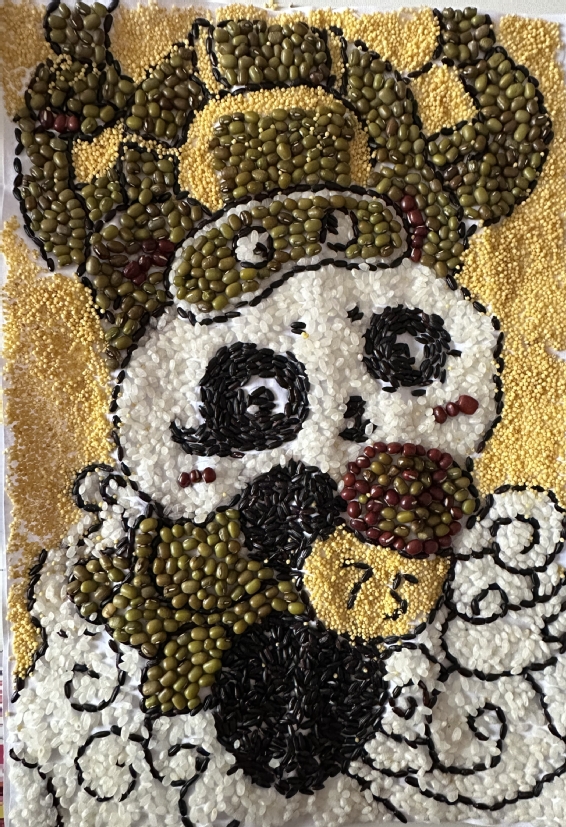 同学们以五谷为媒,以中华文化为核心主题,运用龙、熊猫、和平鸽等典型形象,展现民族精神与文化内涵。龙的形象象征中华民族深厚的文化底蕴与生生不息的奋斗精神;火箭升空、宇航员飞天的设计,展现了中国在航天科技领域的飞速发展与民族自立自强的时代精神。作品整体以劳动、收获和希望为核心意象,通过构图、色彩与寓意的巧妙融合,表达了同学们对文化传承的责任感以及对国家未来发展的坚定信心。