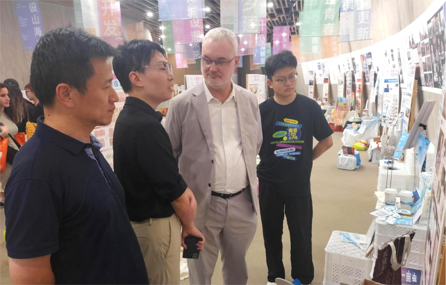 学子的作品在展览中深受国内外学者的认可与欢迎。褚力副教授用英语向西班牙马德里理工大学亚洲事务校长代表Xavier Ferre Grau先生介绍了学生作品,Xavier Ferre Grau先生积极肯定了我校学生的毕业设计创新能力和价值。