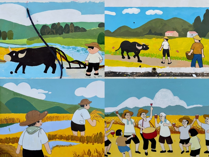 针对当地稻虾共作特色产业,杨芳老师带领学生们创作了《二十四节气图》,其中《夏至》《秋分》两幅墙绘极具代表性,画面中,农户们在田间劳作,水田插秧、稻穗金黄、虾肥鱼跃,细腻生动呈现在墙面上。村民们驻足观赏,感慨不已,“这些画把农忙生活变成了咱能看懂的画面,党的好政策就像这稻穗一样,在我们这里结满了幸福。