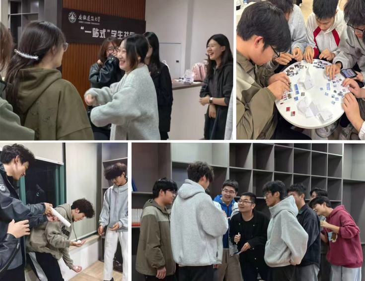 老师们鼓励同学们在活动中敞开心扉、增进友谊,学会将艺术创作中的感悟力与抗压力转化为面对生活的积极心态,真正做到“艺”心向阳,筑梦成长。这番话语如涓涓细流,滋润着每一位参与学生的心田,也为接下来的活动奠定了温暖的基调。在“词语传声筒”环节,抽象的专业术语与日常词汇在同学们惟妙惟肖的肢体语言与天马行空的联想中传递。在“乒乓保卫战”中,小小的乒乓球在轨道上滚动,如同我们共同守护的集体荣誉与内心那份纯粹的快乐。每一次成功的传递,都伴随着全组的欢呼;每一次失误,也引发了大家不断的鼓励。在“共‘建’安建大蓝图”活动中,各组同学通力协作,将散落的图片拼合成我们熟悉的校园地标建筑。方寸之间,凝聚的是对校园的热爱;巧手之下,构筑的是团队的凝聚力。当一幅完整的安建大画卷展现在眼前时,自豪感与归属感在每个人心中油然而生。
