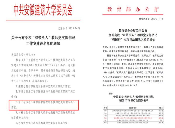 本网讯  在学校及学院党委坚强领导下,电子与信息工程学院智能控制系教工党支部扎实推进“双带头人”书记工作室培育建设,着力构建“五聚焦 五坚持”党支部工作新模式,探索党建和业务工作同频共振、相融相促新路径。2019年12月,党支部获批教育部第二批全国党建工作样板支部培育创建单位,2022年通过验收;2022年11月,党支部被遴选为校“双带头人”教师党支部书记工作室立项建设单位;2024年10月,党支部入选全国高校“双带头人”教师党支部书记“强国行”专项行动团队。